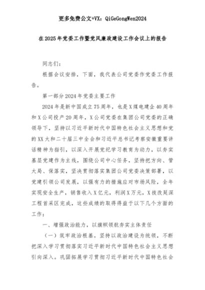 【七哥公文】2025年:在2025年党委工作暨党风廉政建设工作会议上的报告+更多免费公文+VX:QiGeGongWen2024+更多免费公文+VX:QiGeGongWen2024