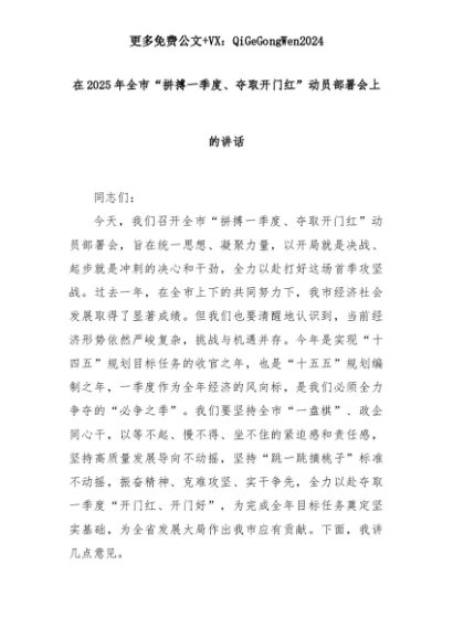 【七哥公文】2025年:在2025年全市“拼搏一季度、夺取开门红”动员部署会上的讲话+更多免费公文+VX:QiGeGongWen2024+更多免费公文+VX:QiGeGongWen2024