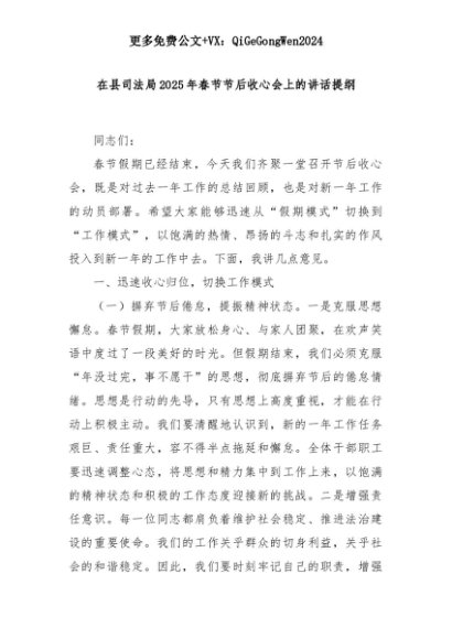 【七哥公文】2025年:在县司法局2025年春节节后收心会上的讲话提纲+更多免费公文+VX:QiGeGongWen2024+更多免费公文+VX:QiGeGongWen2024