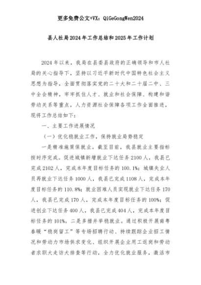 【七哥公文】2025年:县人社局2024年工作总结和2025年工作计划+更多免费公文+VX:QiGeGongWen2024+更多免费公文+VX:QiGeGongWen2024