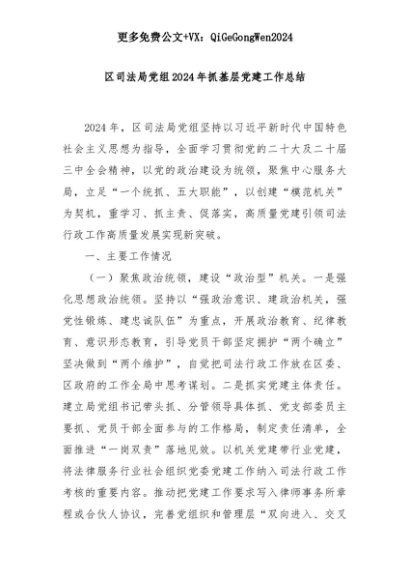 【七哥公文】2025年:区司法局党组2024年抓基层党建工作总结+更多免费公文+VX:QiGeGongWen2024+更多免费公文+VX:QiGeGongWen2024