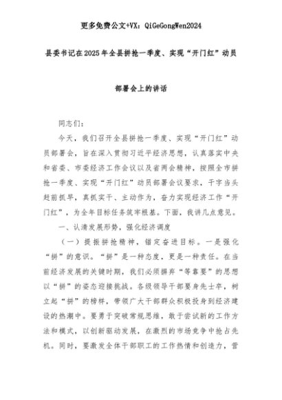 【七哥公文】2025年:县委书记在2025年全县拼抢一季度、实现“开门红”动员部署会上的讲话+更多免费公文+VX:QiGeGongWen2024+更多免费公文+VX:QiGeGongWen2024