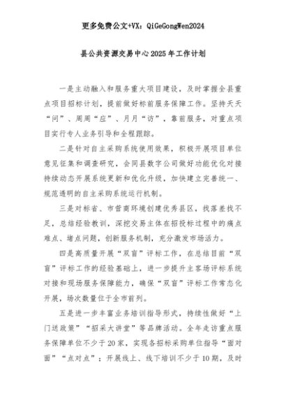 【七哥公文】2025年:县公共资源交易中心2025年工作计划+更多免费公文+VX:QiGeGongWen2024+更多免费公文+VX:QiGeGongWen2024