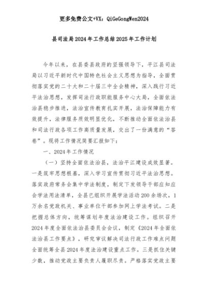 【七哥公文】2025年:县司法局2024年工作总结2025年工作计划+更多免费公文+VX:QiGeGongWen2024+更多免费公文+VX:QiGeGongWen2024
