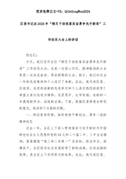 【七哥公文】2025年:区委书记在2025年“铆足干劲抓落实奋勇争先开新局”工作动员大会上的讲话+更多免费公文+VX:QiGeGongWen2024+更多免费公文+VX:QiGeGongWen2024