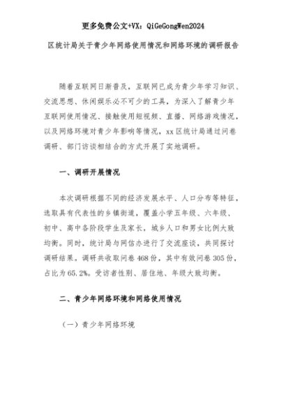 【七哥公文】2025年:区统计局关于青少年网络使用情况和网络环境的调研报告+更多免费公文+VX:QiGeGongWen2024+更多免费公文+VX:QiGeGongWen2024