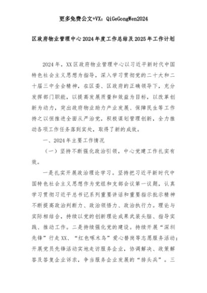 【七哥公文】2025年:区政府物业管理中心2024年度工作总结及2025年工作计划+更多免费公文+VX:QiGeGongWen2024+更多免费公文+VX:QiGeGongWen2024