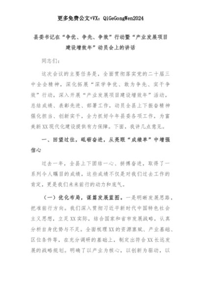 【七哥公文】2025年:县委书记在“争优、争先、争效”行动暨“产业发展项目建设增效年”动员会上的讲话+更多免费公文+VX:QiGeGongWen2024+更多免费公文+VX:QiGeGongWen2024