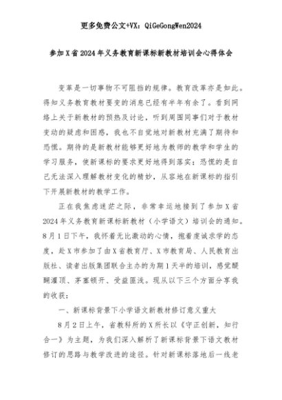 【七哥公文】2025年:参加X省2024年义务教育新课标新教材培训会心得体会+更多免费公文+VX:QiGeGongWen2024+更多免费公文+VX:QiGeGongWen2024