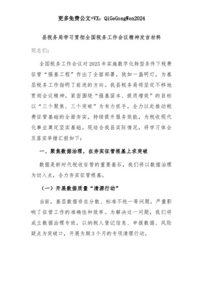 【七哥公文】2025年:县税务局学习贯彻全国税务工作会议精神发言材料+更多免费公文+VX:QiGeGongWen2024+更多免费公文+VX:QiGeGongWen2024