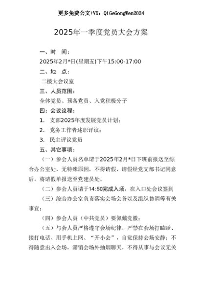 【七哥公文】2025年:03-2025年一季度党员大会方案(2月版)+更多免费公文+VX:QiGeGongWen2024+更多免费公文+VX:QiGeGongWen2024