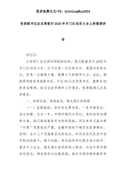 【七哥公文】2025年:党委副书记在农商银行2025年开门红动员大会上的强调讲话+更多免费公文+VX:QiGeGongWen2024+更多免费公文+VX:QiGeGongWen2024