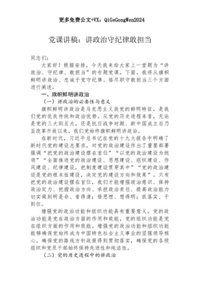 【七哥公文】2025年:党课讲稿:讲政治+守纪律+敢担当+更多免费公文+VX:QiGeGongWen2024+更多免费公文+VX:QiGeGongWen2024