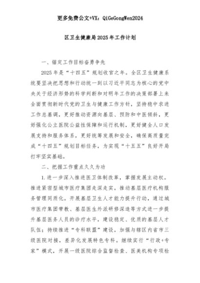【七哥公文】2025年:区卫生健康局2025年工作计划+更多免费公文+VX:QiGeGongWen2024+更多免费公文+VX:QiGeGongWen2024