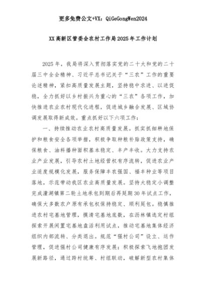 【七哥公文】2025年:XX高新区管委会农村工作局2025年工作计划+更多免费公文+VX:QiGeGongWen2024+更多免费公文+VX:QiGeGongWen2024