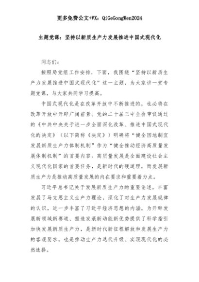 【七哥公文】2025年:主题党课:坚持以新质生产力发展推进中国式现代化+更多免费公文+VX:QiGeGongWen2024+更多免费公文+VX:QiGeGongWen2024