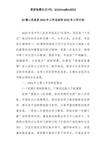 【七哥公文】2025年:XX镇人民政府2024年工作总结和2025年工作计划+更多免费公文+VX:QiGeGongWen2024+更多免费公文+VX:QiGeGongWen2024