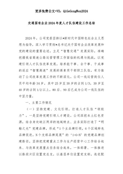 【七哥公文】2025年:交通国有企业2024年度人才队伍建设工作总结+更多免费公文+VX:QiGeGongWen2024+更多免费公文+VX:QiGeGongWen2024