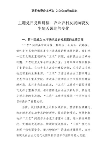 【七哥公文】2025年:主题党日党课讲稿:农业农村发展面貌发生翻天覆地的变化+更多免费公文+VX:QiGeGongWen2024+更多免费公文+VX:QiGeGongWen2024