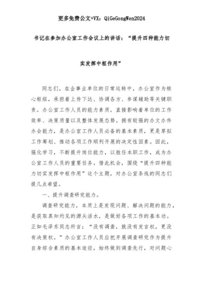 【七哥公文】2025年:书记在参加办公室工作会议上的讲话:“提升四种能力切实发挥中枢作用”+更多免费公文+VX:QiGeGongWen2024+更多免费公文+VX:QiGeGongWen2024