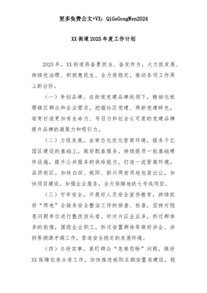 【七哥公文】2025年:XX街道2025年度工作计划+更多免费公文+VX:QiGeGongWen2024+更多免费公文+VX:QiGeGongWen2024