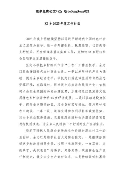 【七哥公文】2025年:XX乡2025年度工作计划+更多免费公文+VX:QiGeGongWen2024+更多免费公文+VX:QiGeGongWen2024