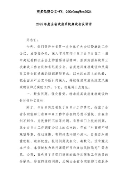 【七哥公文】2025年:2025年度全省政府系统廉政会议讲话+更多免费公文+VX:QiGeGongWen2024+更多免费公文+VX:QiGeGongWen2024