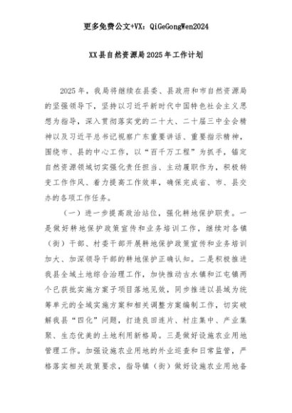 【七哥公文】2025年:XX县自然资源局2025年工作计划+更多免费公文+VX:QiGeGongWen2024+更多免费公文+VX:QiGeGongWen2024