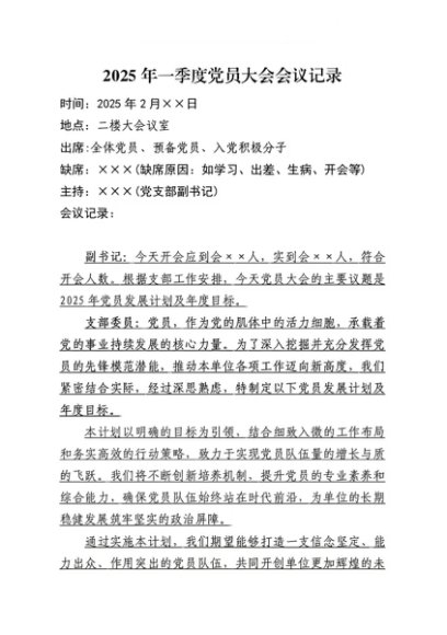 【七哥公文】2025年:2025年一季度党员大会会议记录(2月版)+更多免费公文+VX:QiGeGongWen2024+更多免费公文+VX:QiGeGongWen2024
