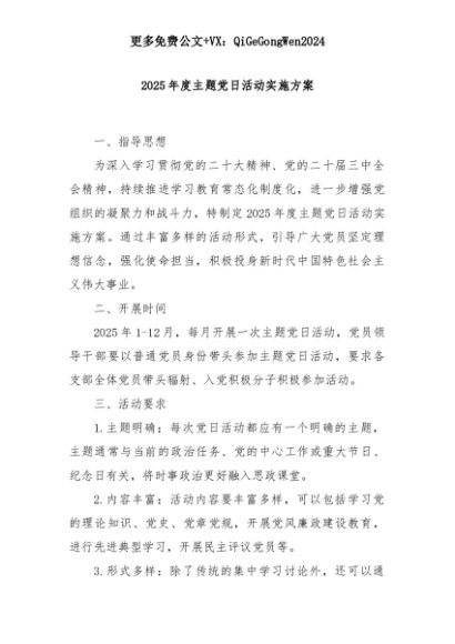 【七哥公文】2025年:2025年度主题党日活动实施方案+更多免费公文+VX:QiGeGongWen2024+更多免费公文+VX:QiGeGongWen2024