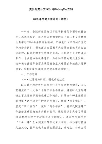 【七哥公文】2025年:2025年党建工作计划(学校)+更多免费公文+VX:QiGeGongWen2024+更多免费公文+VX:QiGeGongWen2024