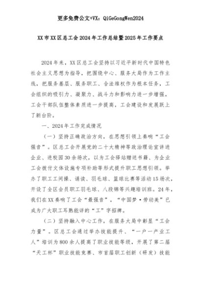 【七哥公文】2025年:XX市XX区总工会2024年工作总结暨2025年工作要点+更多免费公文+VX:QiGeGongWen2024+更多免费公文+VX:QiGeGongWen2024
