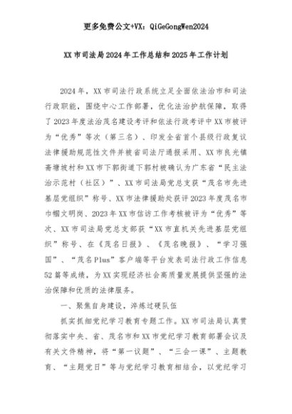 【七哥公文】2025年:XX市司法局2024年工作总结和2025年工作计划+更多免费公文+VX:QiGeGongWen2024+更多免费公文+VX:QiGeGongWen2024