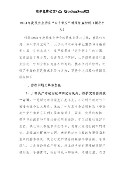 【七哥公文】2025年:2024年度民主生活会“四个带头”对照检查材料(领导个人)+更多免费公文+VX:QiGeGongWen2024+更多免费公文+VX:QiGeGongWen2024