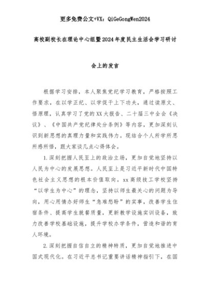 【七哥公文】2025年:高校副校长在理论中心组暨2024年度民主生活会学习研讨会上的发言+更多免费公文+VX:QiGeGongWen2024+更多免费公文+VX:QiGeGongWen2024