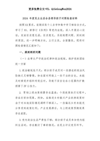 【七哥公文】2025年:2024 年度民主生活会县领导班子对照检查材料+更多免费公文+VX:QiGeGongWen2024+更多免费公文+VX:QiGeGongWen2024