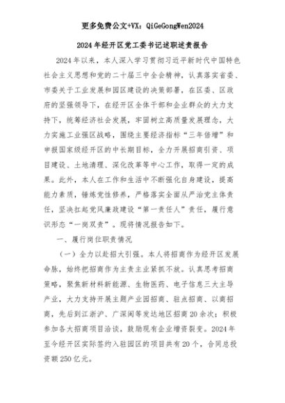 【七哥公文】2025年:2024年经开区党工委书记述职述责报告+更多免费公文+VX:QiGeGongWen2024+更多免费公文+VX:QiGeGongWen2024