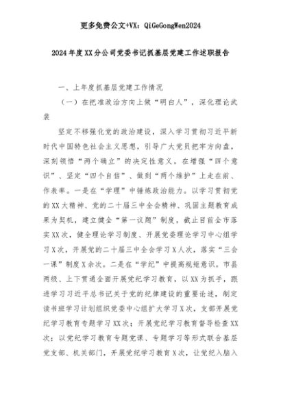 【七哥公文】2025年:2024年度XX分公司党委书记抓基层党建工作述职报告+更多免费公文+VX:QiGeGongWen2024+更多免费公文+VX:QiGeGongWen2024