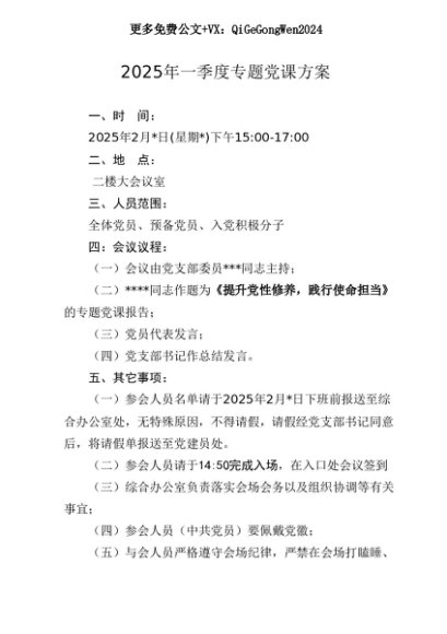 【七哥公文】2025年:04-2025年一季度专题党课方案(2月版)+更多免费公文+VX:QiGeGongWen2024+更多免费公文+VX:QiGeGongWen2024