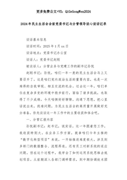 【七哥公文】2025年:2024年民主生活会会前党委书记与分管领导谈心谈话记录+更多免费公文+VX:QiGeGongWen2024+更多免费公文+VX:QiGeGongWen2024