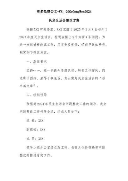 【七哥公文】2025年:民主生活会整改方案+更多免费公文+VX:QiGeGongWen2024+更多免费公文+VX:QiGeGongWen2024