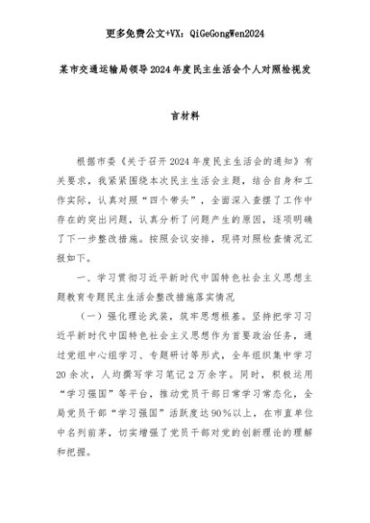 【七哥公文】2025年:某市交通运输局领导2024年度民主生活会个人对照检视发言材料+更多免费公文+VX:QiGeGongWen2024+更多免费公文+VX:QiGeGongWen2024