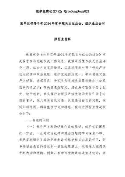 【七哥公文】2025年:某单位领导干部2024年度专题民主生活会、组织生活会对照检查材料+更多免费公文+VX:QiGeGongWen2024+更多免费公文+VX:QiGeGongWen2024