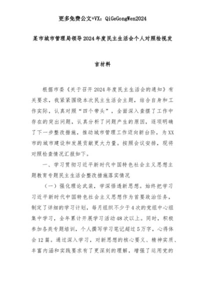 【七哥公文】2025年:某市城市管理局领导2024年度民主生活会个人对照检视发言材料+更多免费公文+VX:QiGeGongWen2024+更多免费公文+VX:QiGeGongWen2024