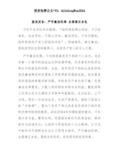 【七哥公文】2025年:座谈发言:严守廉洁纪律 永葆清正本色+更多免费公文+VX:QiGeGongWen2024+更多免费公文+VX:QiGeGongWen2024