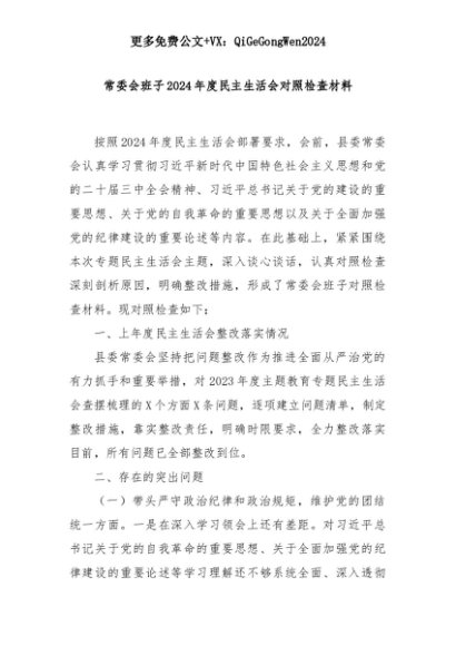 【七哥公文】2025年:常委会班子2024年度民主生活会对照检查材料+更多免费公文+VX:QiGeGongWen2024+更多免费公文+VX:QiGeGongWen2024