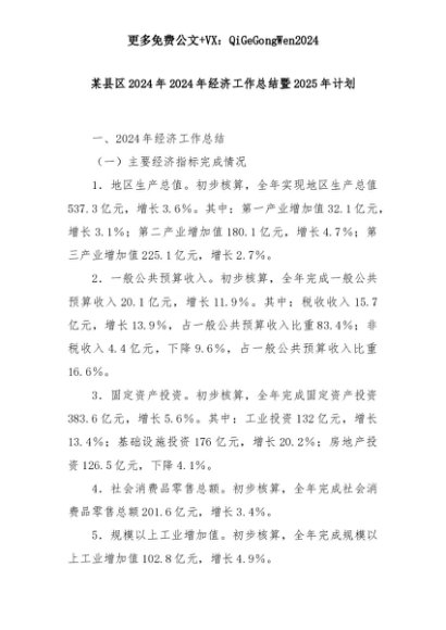 【七哥公文】2025年:某县区2024年2024年经济工作总结暨2025年计划+更多免费公文+VX:QiGeGongWen2024+更多免费公文+VX:QiGeGongWen2024