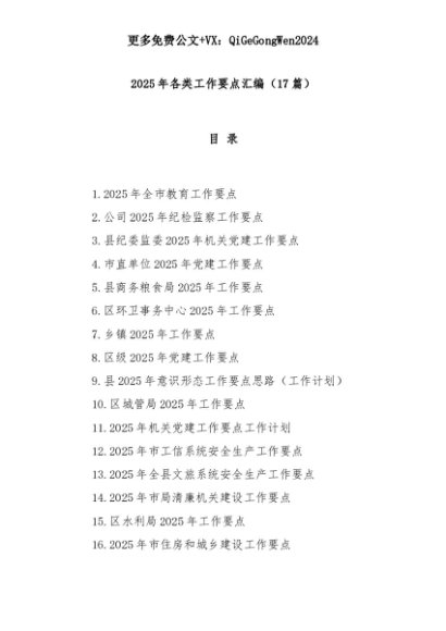 【七哥公文】2025年:(17篇)2025年各类工作要点汇编+更多免费公文+VX:QiGeGongWen2024+更多免费公文+VX:QiGeGongWen2024