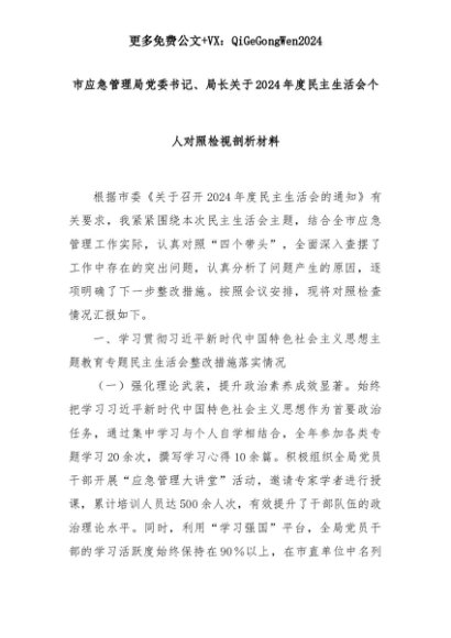 【七哥公文】2025年:市应急管理局党委书记、局长关于2024年度民主生活会个人对照检视剖析材料+更多免费公文+VX:QiGeGongWen2024+更多免费公文+VX:QiGeGongWen2024
