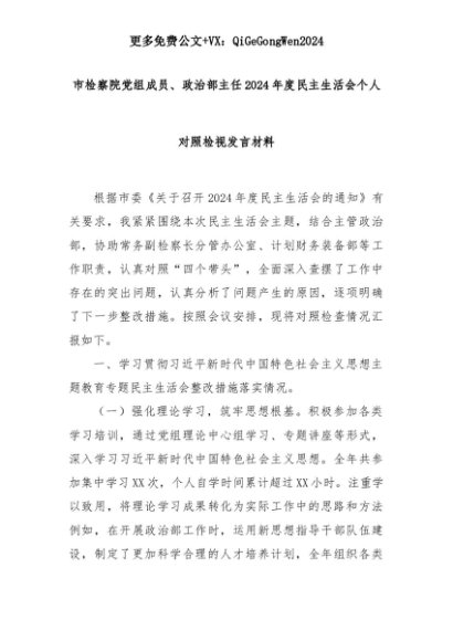 【七哥公文】2025年:市检察院党组成员、政治部主任2024年度民主生活会个人对照检视发言材料+更多免费公文+VX:QiGeGongWen2024+更多免费公文+VX:QiGeGongWen2024